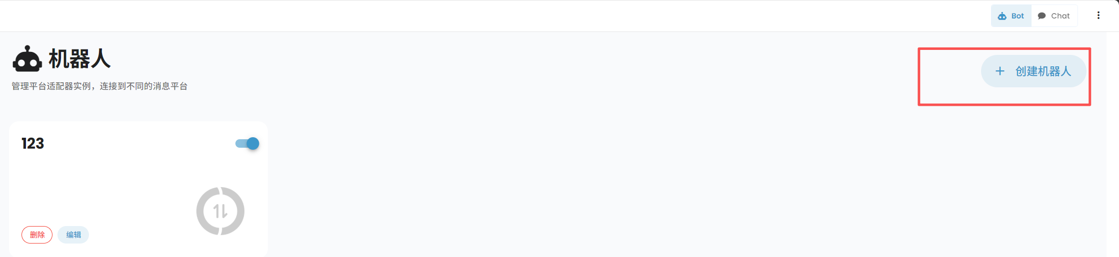 容器构建完成之后使用http://<服务器IP>:6185 访问AstrBot后台根据提示登录后,点击右上角创建机器人