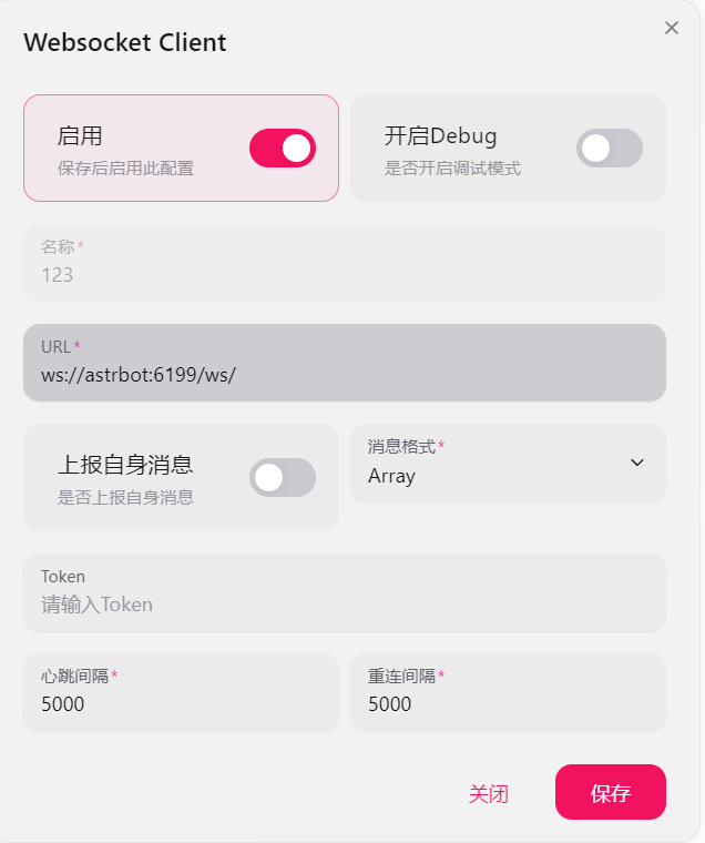 在网络配置中点击新建选择Websocket客户端,输入以下信息,名称可以自定义其他选项和我保持一下,完成后点击保存